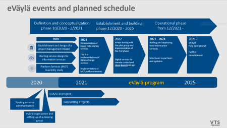 Implemented in 2020–2025, eVäylä is Fintraffic´s Vessel Traffic Services’ project for developing the exchange of information between Fintraffic´s Vessel Traffic Services and port operators and establishing a basis for the digital management of evolving vessel traffic, as well as for implementing the information exchange interfaces between Vessel Traffic Service and shore-based pilotage for meeting the future needs of shore-based pilotage.
