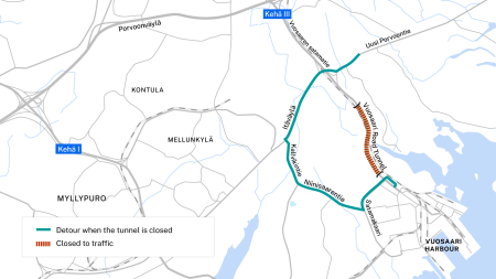When the tunnel is closed, vehicles will use the detour from Itäväylä via Kallvikintie and Niinisaarentie to Vuosaari harbour. This route is normally used as an alternative route during tunnel maintenance work and is also used by special transport vehicles.