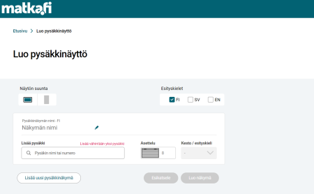 - Muokkaa pysäkkinäkymän nimeä. Nimi näkyy esityksessä, joten se kannattaa valita mahdollisimman kuvaavaksi. Huomaathan, että mikäli valitset useamman esityskielen, pysäkkinäkymän nimi tulee kirjoittaa kaikkiin kieliversioihin.