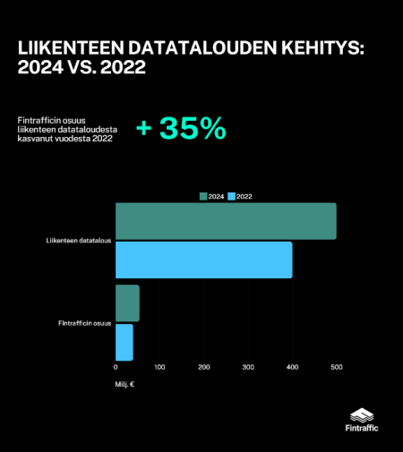 - Vuonna 2024 liikenteen datatalouden arvo oli Suomessa jo noin 500 miljoonaa euroa (400 milj. / 2022) ja Fintrafficin suorien ja epäsuorien vaikutusten yhteenlaskettu osuus tästä noin 54 miljoonaa euroa (40 milj. / 2022). Fintrafficin tuottamien liikenteen datatalouden suorien hyötyjen arvioitiin olevan 16 miljoonaa euroa, kasvua parin vuoden takaiseen tutkimukseen on tullut jopa 60 prosenttia.