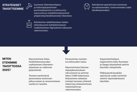 Vuonna 2025 palvelumme laajenivat liikenteenohjauksessa ja -hallinnassa. Käynnistimme merkittävät panostukset uuden junaliikenteen ohjaus- ja hallintajärjestelmän (Atlas-projekti) kehittämiseen. Uusi järjestelmä parantaa junaliikenteen sujuvuutta, turvallisuutta ja liikenteenhallinnan laatua sekä mahdollistaa automaation laajemman hyödyntämisen. Projektin aikataulu mukailee Digiradan aikataulua ja sen kustannusarvio on 200 miljoonaa euroa vuoteen 2040 mennessä.