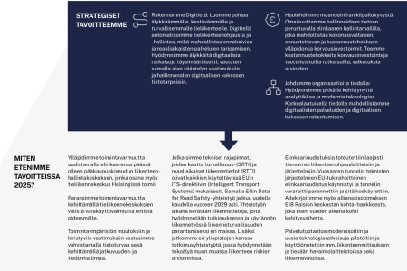 Vuonna 2025 tieliikenteenohjauksessa jatkettiin toimintavarmuuden vahvistamista ja laitteiston elinkaaren mukaista uudistamista. Uusia toteutuksia tehtiin useisiin tunnelikohteisiin sekä tietoliikenneverkkoon, liikennelaskentaan ja tienvarren ohjauslaitteisiin ja -järjestelmiin. Kansallista ja kansainvälistä yhteistyötä jatkettiin, jotta tilannekuva olisi entistä kattavampi ja toiminta häiriötilanteissa mahdollisimman varmaa.