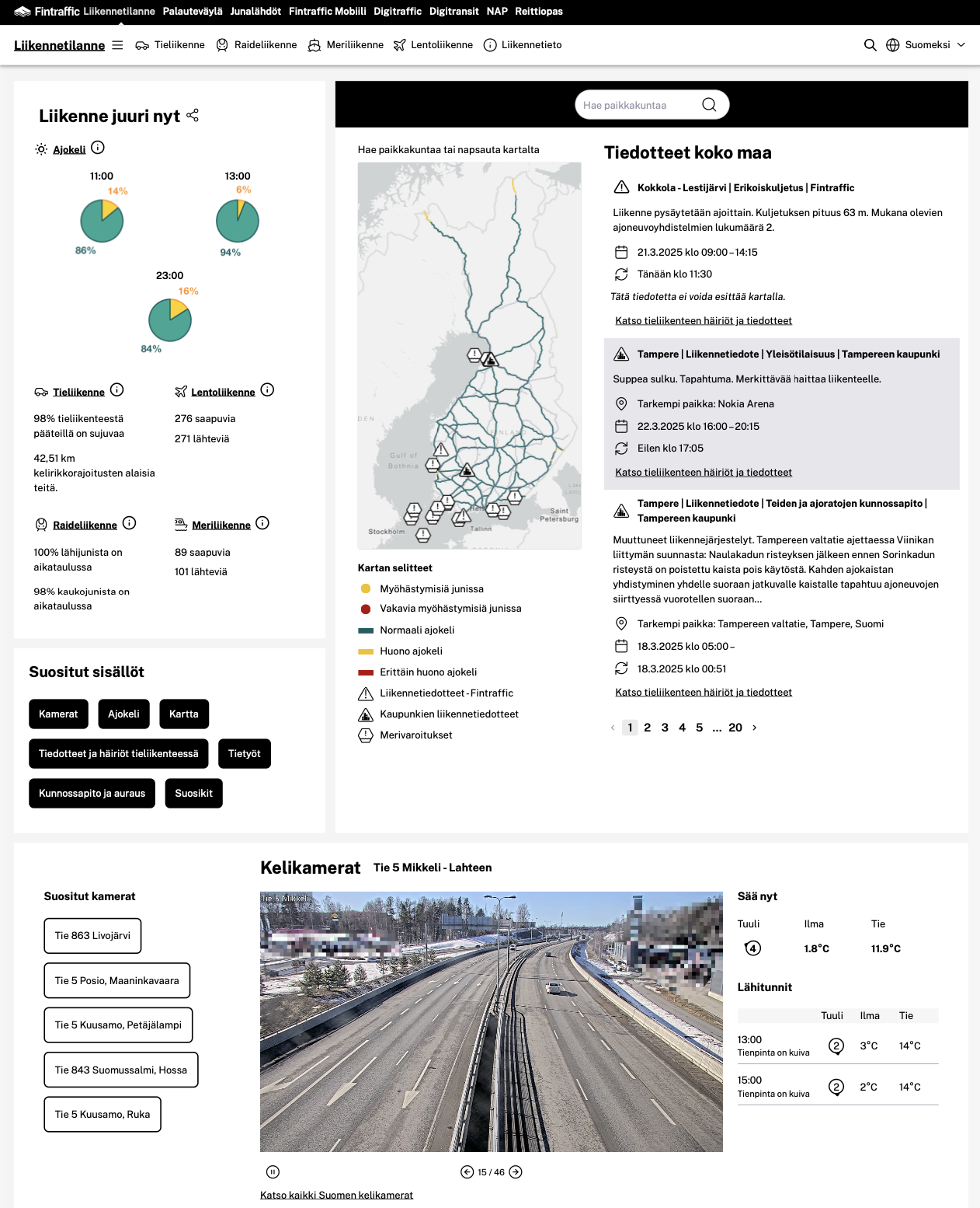 “Uudistuneen Liikennetilanne-palvelun etusivua on kehitetty käyttäjäpalautteen perusteella ja siihen on tuotu runsaammin esille palvelun sisältöä. Palvelun etusivulta käyttäjät näkevät nopeasti ajankohtaiset liikennehäiriöt, sääolosuhteet sekä muun muassa kattavan valikoiman kelikameranäkymiä eri puolilta Suomea”, Fintrafficin Head of Digital Antti Haarala kuvaa.