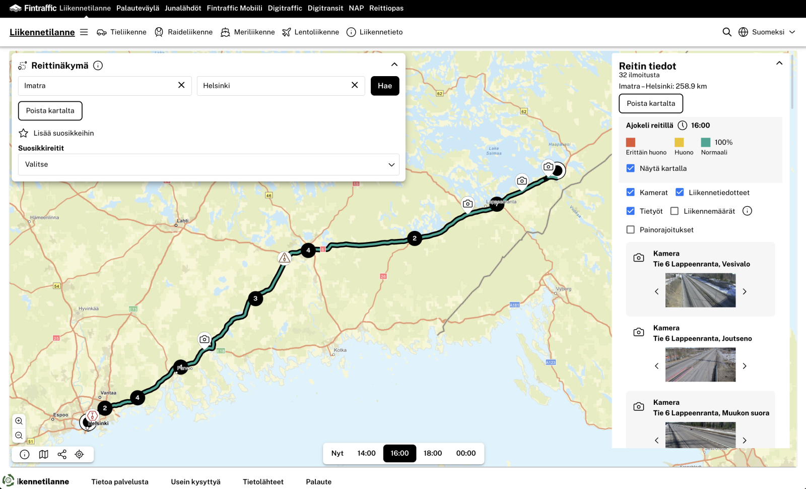 Täysin uusi tieliikenteen reittinäkymä mahdollistaa reittihaun ja tarjoaa mahdollisuuden tarkastella reitin varrella olevia kelitietoa, kelikameroita, tietöitä, ruuhkia ja muita häiriöitä.
