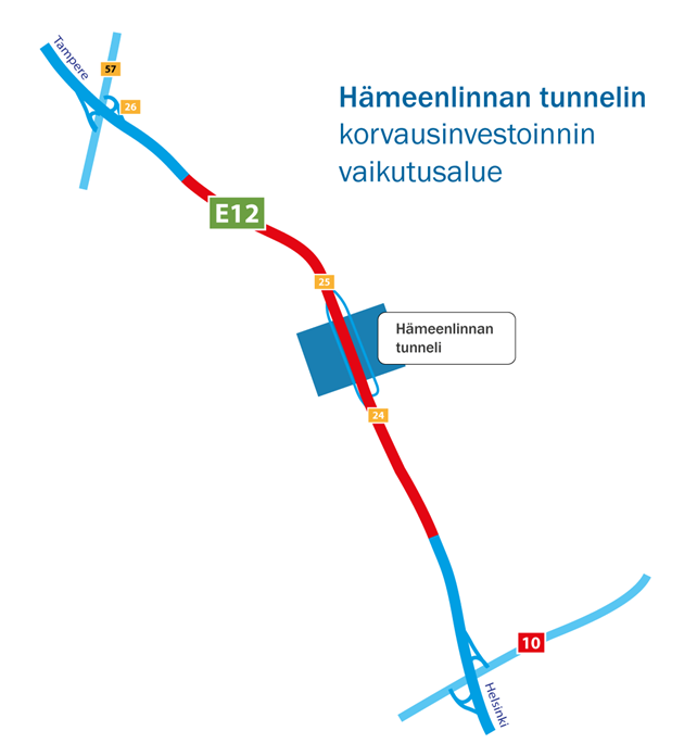 Valtatie 3:lla sijaitsevan Hämeenlinnan tunnelin tekniikan saneeraustöiden maastotyöt jatkuvat ma 22.7. Saneeraustöillä on vaikutusta liikenteelle, joka ohjataan töiden ajaksi osittain kiertotielle.