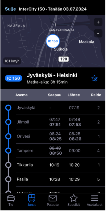 Ilmaiseksi sovelluskaupoista ladattava Fintraffic Mobiili –sovellus on sekä autoilijan että junailijan paras matkakumppani. Uutuutena Fintraffic Mobiili näyttää nyt junien sijainnin, kulkureitin ja nopeuden reaaliaikaisesti kartalla. Tämä on erityisen kätevää odottaessasi junaa tai seuratessasi matkan etenemistä. Lisäksi voit asettaa tietyt junat suosikeiksi, mikä helpottaa niiden seuraamista.