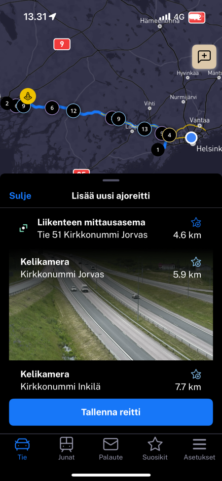 Olemme koonneet palveluun myös näkymiä suosituimmilta tieosuuksilta. Voit luoda myös oman koontinäkymäsi. Tutustu täällä: Koontinäkymät