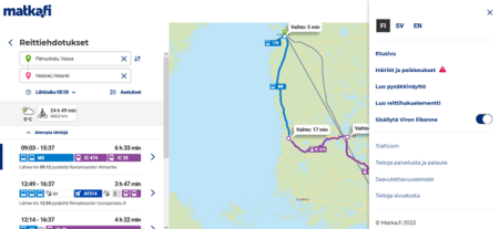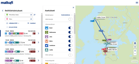 Palvelu tarjoaa useita reittivalintoja ja liikennevälineiden yhdistelmiä. Tutustu ja kokeile!