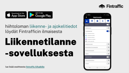 Auto jo pakattu ja mietit, osuuko matkalle huonoa ajokeliä? Lataa nyt puhelimeesi ilmainen Fintrafficin Liikennetilanne-sovellus ja tiedät mitä liikenteessä tapahtuu.