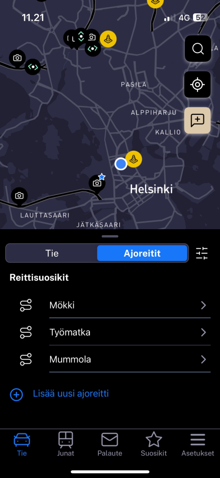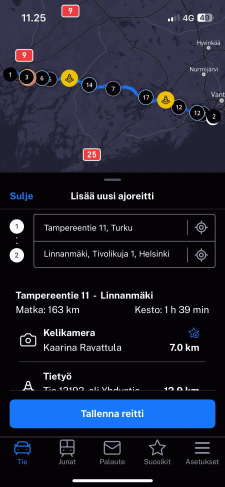 Suomen paras asiakasteko 2024 -palkinnon voittanut Fintraffic Mobiili tarjoaa nyt liikenteessä matkaavien käyttöön uuden, matkan suunnittelua helpottavan ajoreittitoiminnon. Uuden reittihaun avulla käyttäjät voivat tarkastella oman reitin varrella olevia kelikameroita, tietöitä, ruuhkatilanteita sekä seurata talvikeleillä maanteiden auraustilannetta.