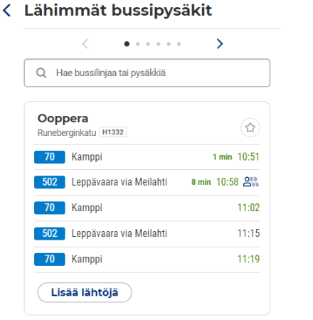 Kuormitustiedon saa näkyviin lähipysäkkinäkymässä, josta voi tarkistaa kulkumuotokohtaisesti kaikki ympärillä olevien pysäkkien seuraaavat lähdöt.