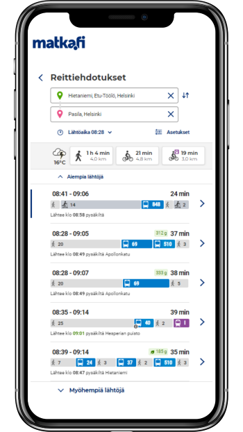 Valinnan jälkeen opas.matka.fi näyttää sähköpotkulaudat vaihtoehtoisina kulkuneuvoina osana reittiehdotuksia, kun suunnittelet matkaasi. Sähköpotkulaudat näkyvät kartalla, ja voit tarkistaa niiden sijainnin sekä saatavuuden reaaliaikaisesti. Tunnistat laudat harmaasta potkulautasymbolista.