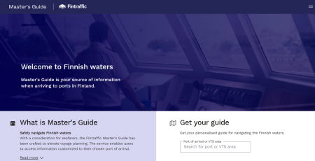 Suomen rannikon alusliikenteelle on saatu tänään 10.11. käyttöön täysin uusi palvelu, kun Fintraffic Master’s Guide on avautunut käyttäjilleen. Uusi Master’s Guide -palvelu tarjoaa Suomen satamiin saapuville aluksille ja muille sidosryhmille kootusti kaikki alusliikenteen tärkeät ohjeistukset parantaen samalla Suomeen saapuvien alusten reittisuunnittelua ja tilannetietoisuutta.