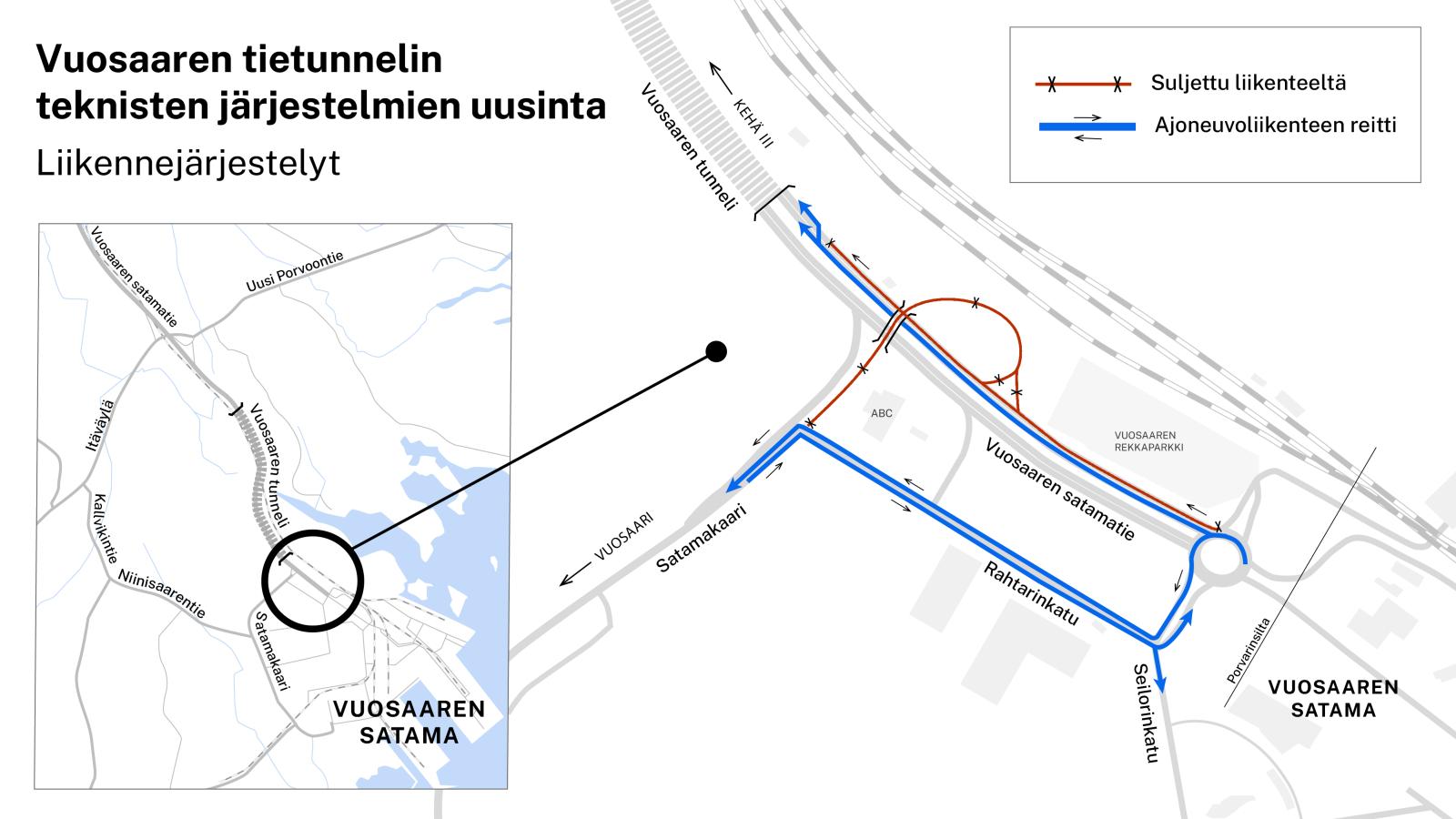 Korjaustyöt Vuosaaren tunnelissa alkavat 6. tammikuuta 2026, jolloin tunneli suljetaan liikenteeltä. Arvioitu tunnelin sulkuaika on noin vuosi. Tänä aikana liikenne ohjataan kiertotielle, joka kulkee Kehä III:lta Itäväylän, Kallvikintien ja Niinisaarentien kautta Vuosaaren satamaan. Reitille on tehty nyt useita parannuksia, jotta liikenne sujuisi mahdollisimman hyvin tunnelin ollessa suljettuna. Tulevan syksyn aikana selvitetään vielä mahdollisia lisäparannustarpeita reitillä.