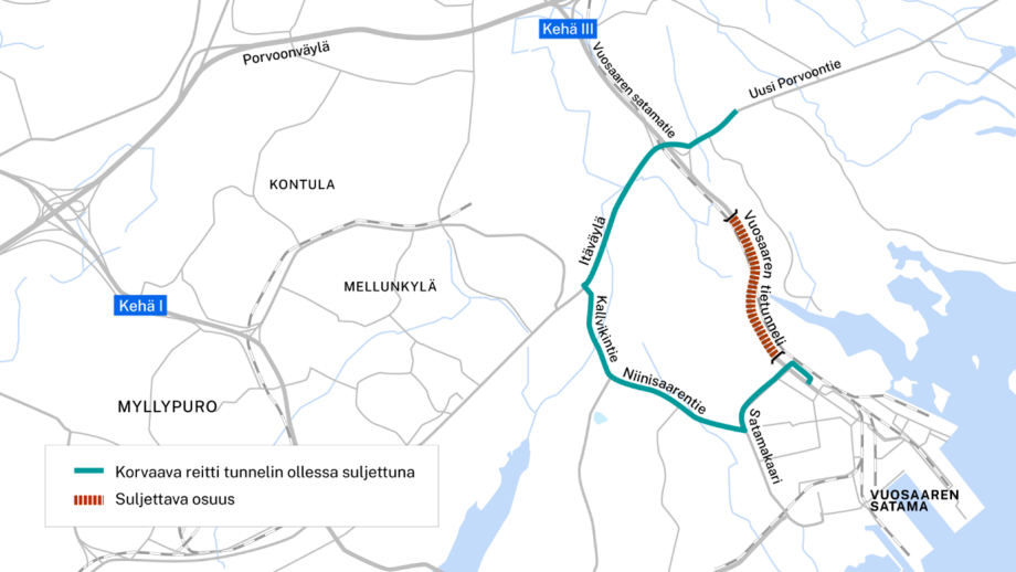Vuosaaren tunnelin ollessa ensi vuoden suljettu remontin takia liikenne siirtyy käyttämään sen virallista varareittiä, joka kulkee Itäväylän, Kallvikintien ja Niinisaarentien kautta Vuosaaren satamaan. Odotettavissa onkin selkeästi kasvaneet liikennemäärät, mikä on hyvä ottaa huomioon omaa liikkumista suunnitellessa.