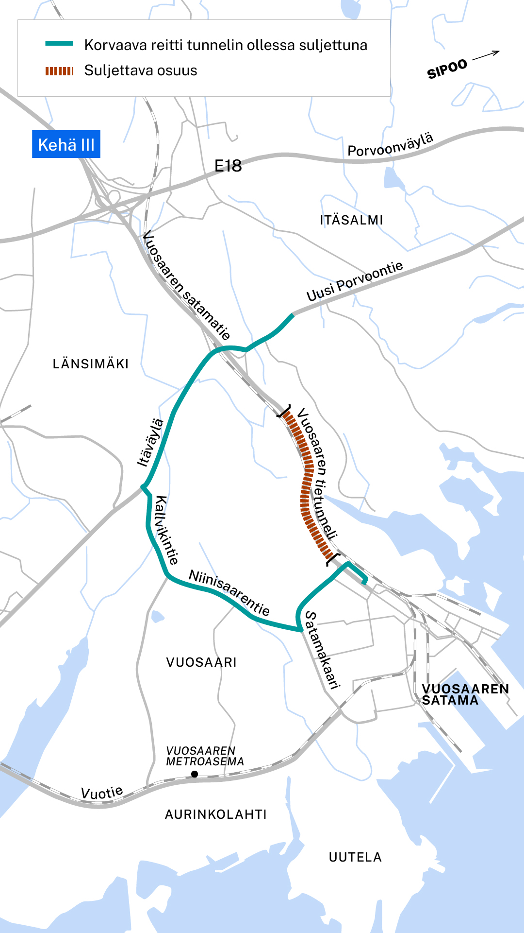 Vuosaaren tunnelin ollessa ensi vuoden suljettu remontin takia liikenne siirtyy käyttämään sen virallista varareittiä, joka kulkee Itäväylän, Kallvikintien ja Niinisaarentien kautta Vuosaaren satamaan. Odotettavissa onkin selkeästi kasvaneet liikennemäärät, mikä on hyvä ottaa huomioon omaa liikkumista suunnitellessa.