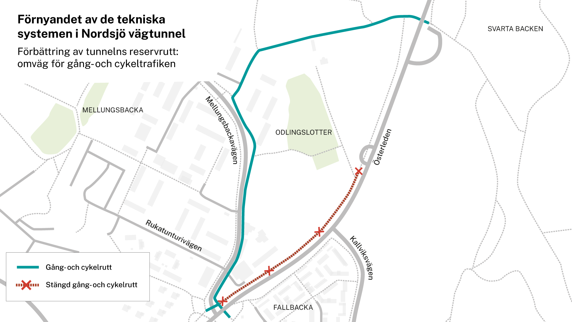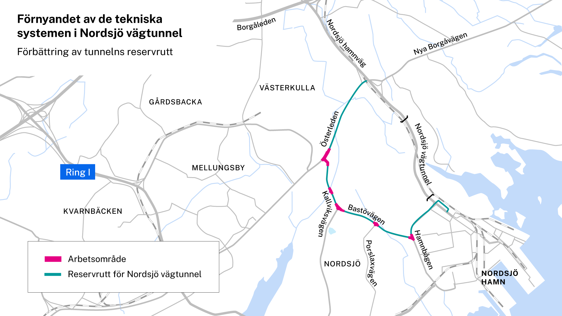 Reservrutten runt Nordsjö vägtunnel på sträckan Österleden–Kallviksvägen–Bastövägen–Nordsjö hamn förbättras under slutet av året och nästa vår. Vägarbetena på reservrutten inleds måndagen den 14 oktober 2024. Genom att förbättra rutten förbereder man sig för den omfattande saneringen av tunneltekniken i Nordsjö tunnel som inleds nästa år och som pågår i nästan ett år. Under denna tid fungerar tunnelns reservrutt som en omväg.