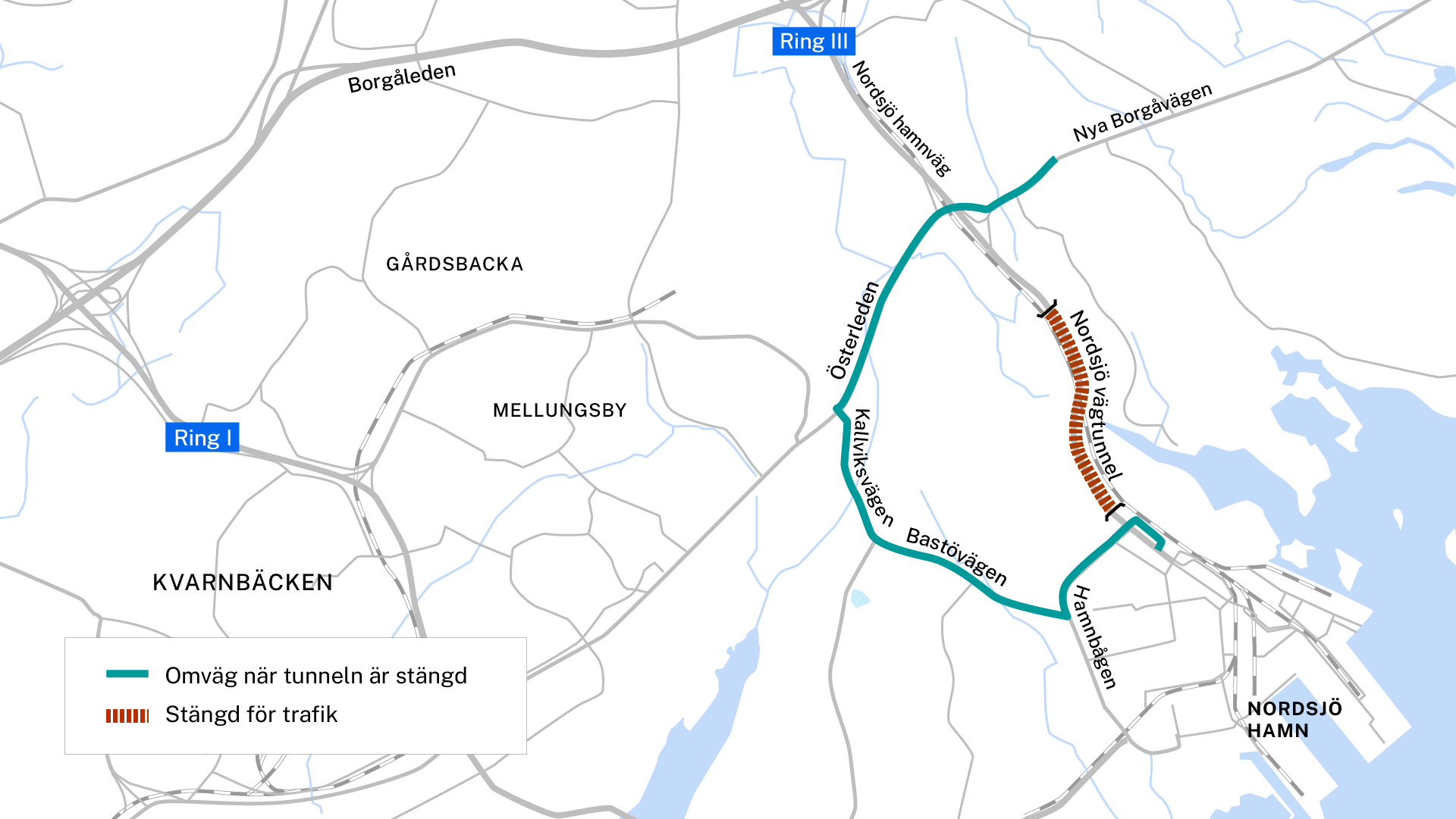 När tunneln är stängd fungerar tunnelns nuvarande reservrutt som omväg på sträckan Österleden–Kallviksvägen–Bastövägen–Nordsjö hamn. Innan reparationsarbetet inleds har man planerat att förbättra omvägens smidighet och säkerhet bland annat i anslutningarna och vid övergångsställena.